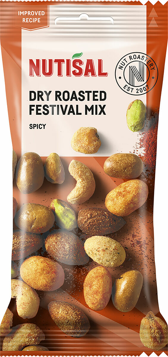 Nutisal Festival Mix Dry Roasted är en het mix av torrostade nötter i olika smak. I påsen finns krispiga cashews, mandlar, majs, pistage, chilinötter samt jordnötter med heta smaker av bland annat barbeque. En perfekt mix av nötter för nötälskaren som gillar det lite starkare! Påsen innehåller 60 g.