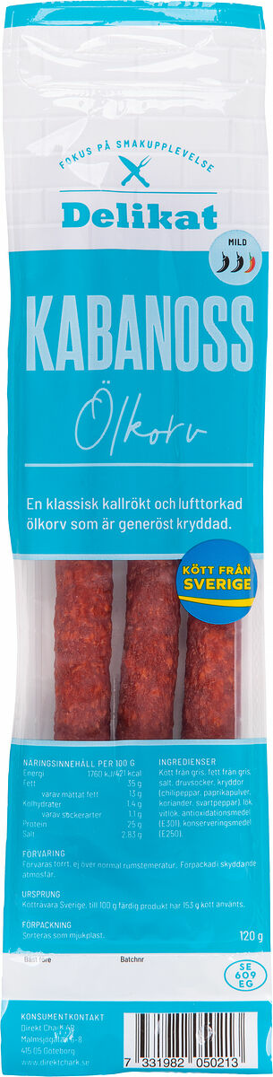 Ingredienser: Kött från gris, salt, druvsocker, kryddor (koriander (0,3%), paprika, chili, peppar (0,2%), vitlök (0,1%)), lök, antioxidationsmedel (E301), konserveringsmededel (E250). Kötthalt, till 100g färdig vara har 142g kött använts. Ursprung köttråvara: Danmark, Sverige.
