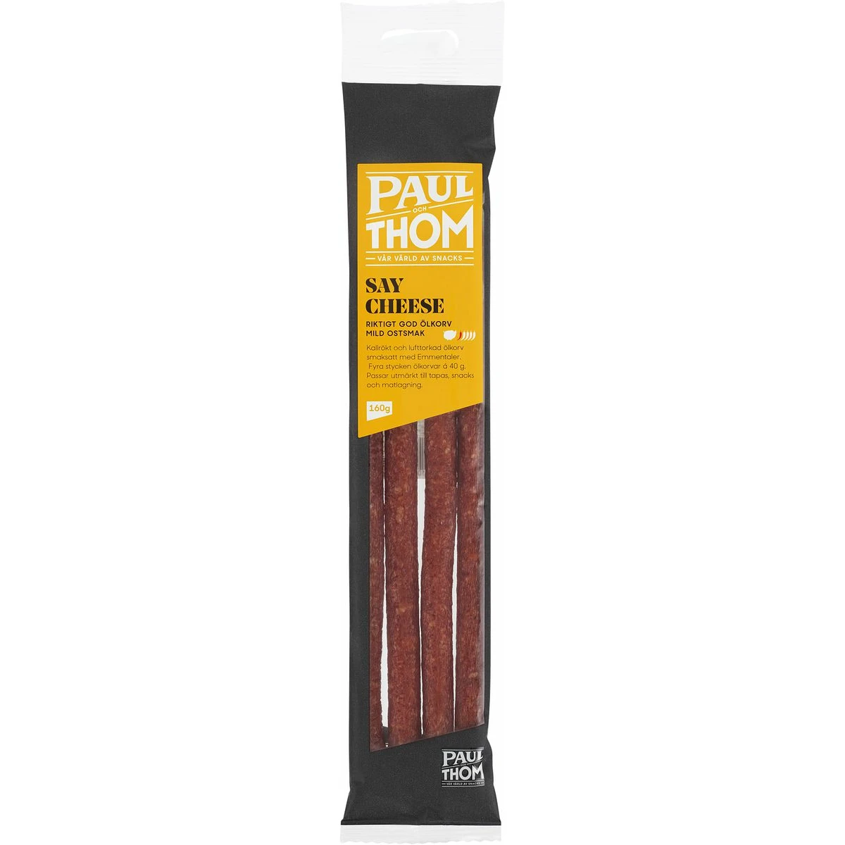 Kallrökt och lufttorkad ölkorv smaksatt med Emmentaler ost. Passar utmärkt till tapas, snacks och mellanmål. 4 stycken à 40 gram per förpackning.