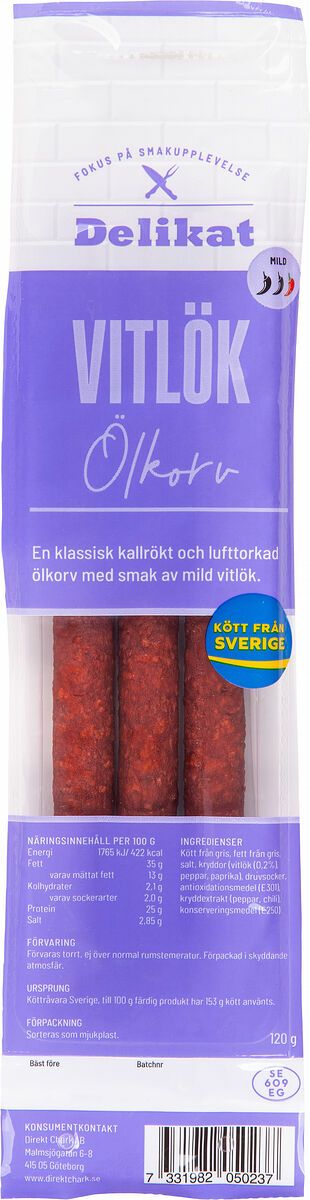 Kött från gris, fett från gris, salt, kryddor (vitlök (0,2%), peppar, paprika), druvsocker, antioxidationsmedel (E301), kryddextrakt (peppar, chili), konserveringsmedel (E250) Till 100g färdig vara har 153g kött använts.