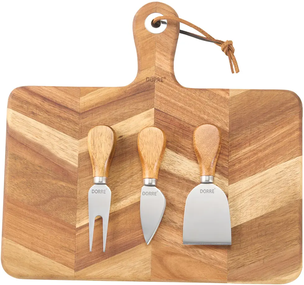 Elegant serveringsbricka i akaciaträ med vackert fiskbensmönster och tre praktiska ostverktyg i rostfritt stål. Perfekt för att servera ost och tillbehör vid middagar och fest.