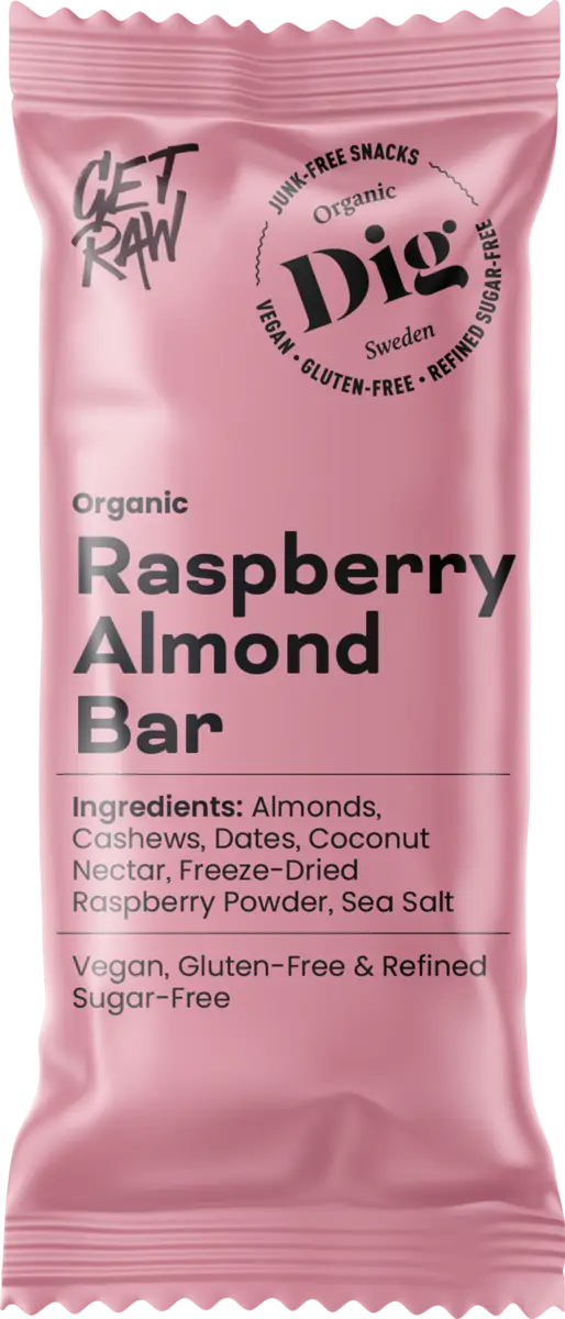 Vi blandade ihop några av våra favoritingredienser i en behändig bar. Och den är läcker. Söta och krispiga mandlar, krämiga cashewnötter, karamelliga välsmakande dadlar. Och en nyplockad näve hallon från leden. Redo att åka vart du än ska. Som alltid är det ekologiskt, veganskt och glutenfritt.