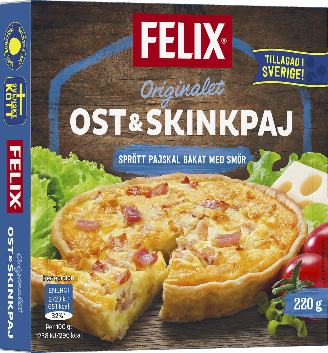 Sveriges mest omtyckta matpaj. Felix Ost och Skinkpaj har en krämig fyllning, smakrik ost och rökt skinka i ett sprött pajskal. Gjord på färsk grädde och mjölk. En av våra mest omtyckta varianter. Passar bra som en lätt lunch på jobbet eller som snabb middag. Bakad med omsorg i Dalarna. Smaklig spis!