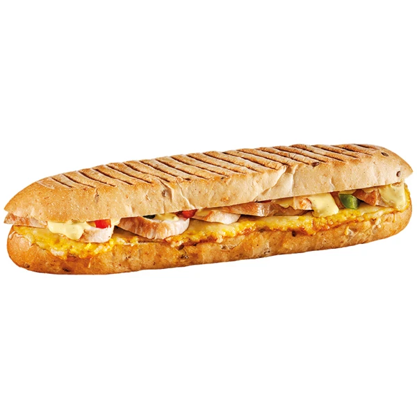 Paninibröd fyllt med stekt kyckling och paninikökets egen curry-mangomajonnäs som innehåller edamerost. Kycklingpaninin är laktosfri.