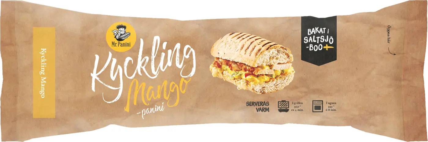 Paninibröd (ursprungsland Sverige) 47% (vetemjöl, vatten, solrosfrö, linfrö, vetegluten, salt, vetekli, jäst, rapsolja, socker, druvsocker, maltmjöl av korn), MANGO-majonnäs (rybsolja, edamerost (ursprungsland Finland) (mjölk, syrningskultur, ystningsenzym, surhetsreglerande medel (E509), (E460)), paprika, vatten, äggula, mangopuré, socker, Thai Sweet chili (vatten, socker, sambal oelek 11% (röd chilipeppar, salt, syra: E260), paprika, modifierad majsstärkelse, syra E260, salt, vitlök, lök, konserveringsmedel E211), ättika, senapsfrö, kryddor, förtjockningsmedel(E412,E415), Kyckling 17 % (ursprungsland Sverige) (kycklinglårfilé, solrosolja, salt, svartpeppar, stärkelse, maltodextrin. Till 100 g produkt har använts 111 g kyckling).