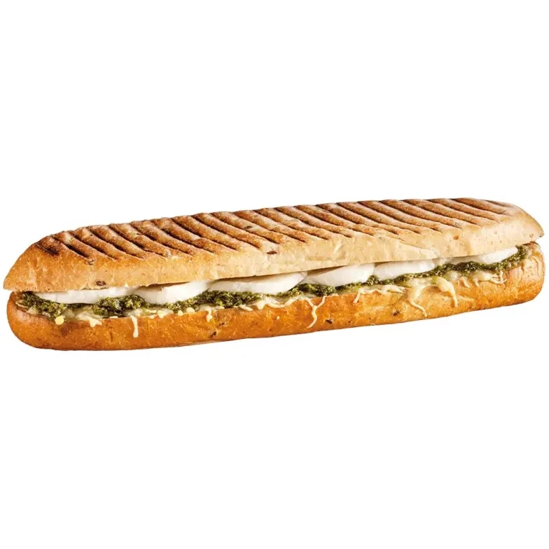Panini av fiberrikt bröd fylld med läcker mozzarellaost, pesto och soltorkade tomater. Paninikökets egen fylliga pestomajonnäs med en gnutta edamerost rundar av helheten.