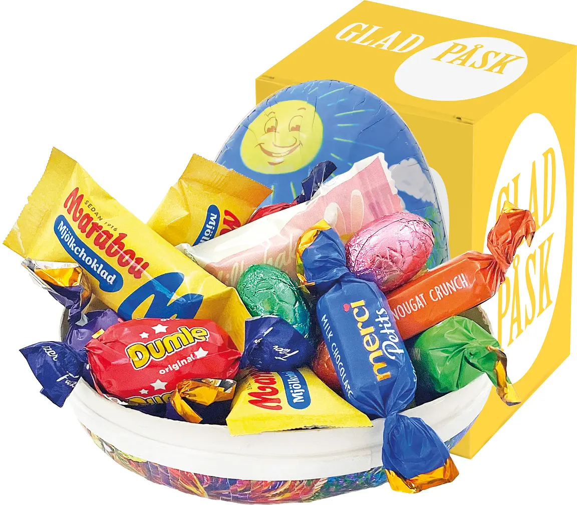 Påskägg 12 cm med Happy Easter Lyx inslagen & twistad godisblandning inkl. gul påskbox Glad Påsk: