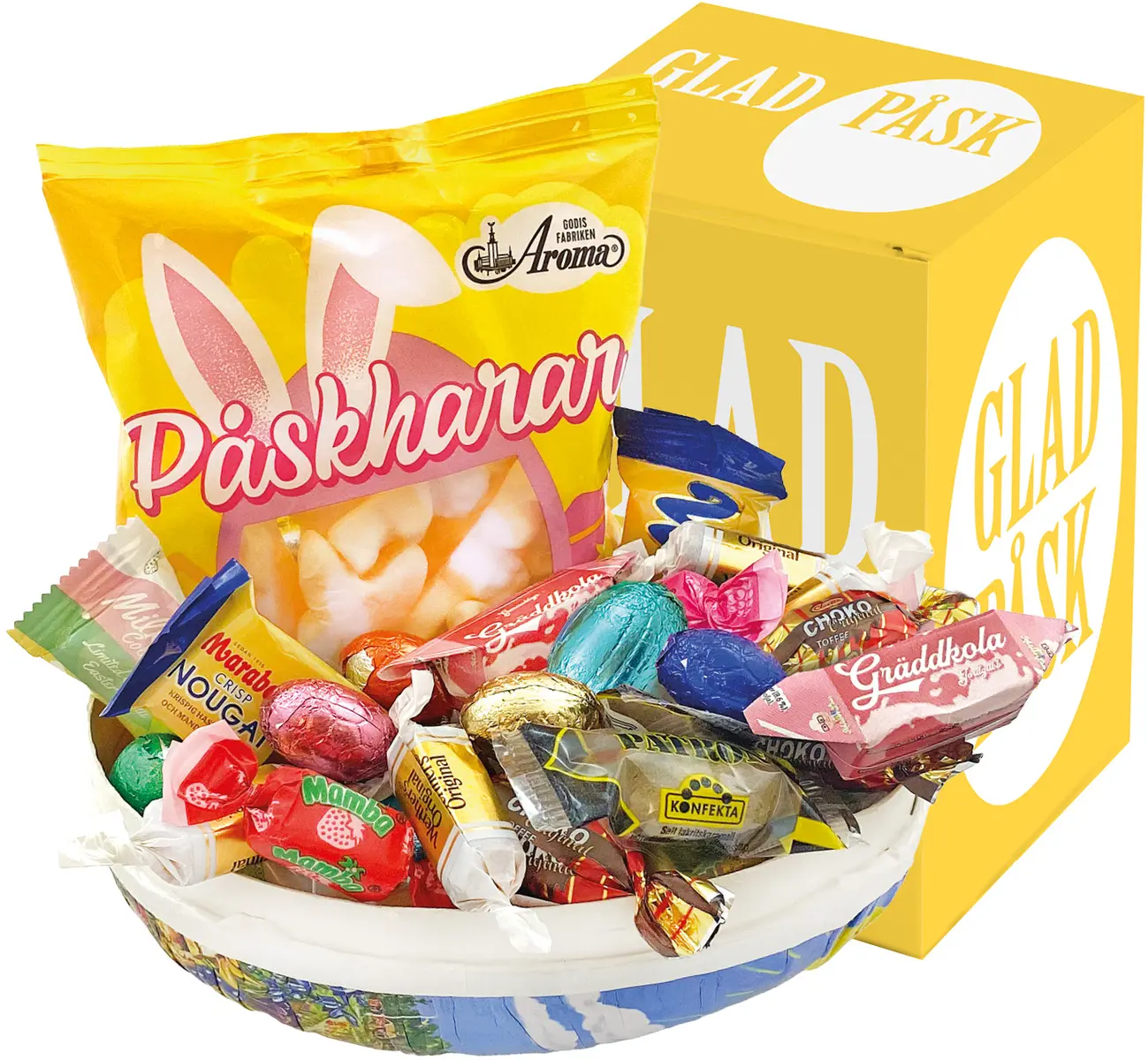 Pris per påskägg 18 cm med Glad Påsk inslagen & twistad godisblandning inkl. gul påskbox Glad Påsk enligt nedan: