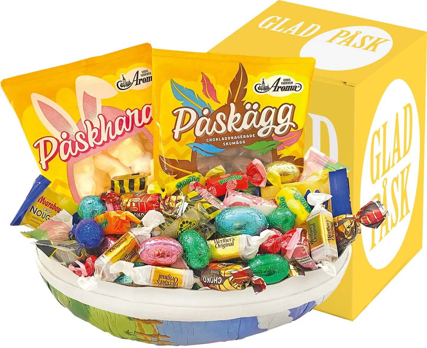 Påskägg 23 cm med Glad Påsk inslagen & twistad godisblandning inkl. gul påskbox Glad Påsk: