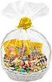 Packas i Korg Gunnar vit oval med grepe L 35x27x15/38 cm med cellofan och dragbandsrosett Gul Splendene 30 mm.