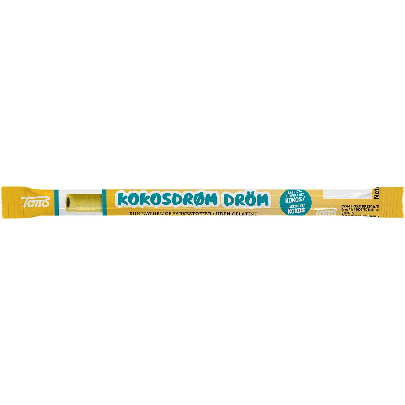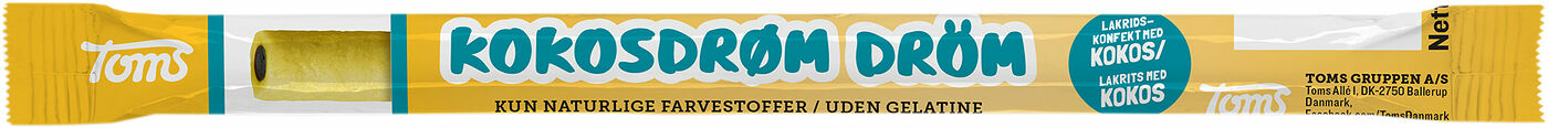 En av Toms populära stänger, vardagligt kallad pingvinstång. Kokosdröm är gul med en kärna av svart lakrits och den har en god kokossmak. Du finner även denna stång i mindre bitar i lösviktsförsäljningen. Kokosdröm är utan gelatin och innehåller endast naturliga färgämnen. Pingvinstängerna finns i många olika smaker så att alla kan hitta sin favorit.