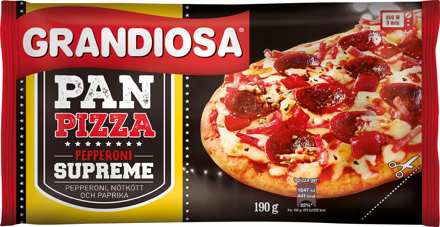 Grandiosa Pan Pizza Supreme är en av Grandiosas mest älskade pizzasmaker! En klassiker gjord för dig som vill ha en stor upplevelse i ett litet format. Pan-bakad pizza med smakrik pepperoni, nötkött, paprika och mycket ost, den ultimata pizzan när man vill gå all in på pizza.