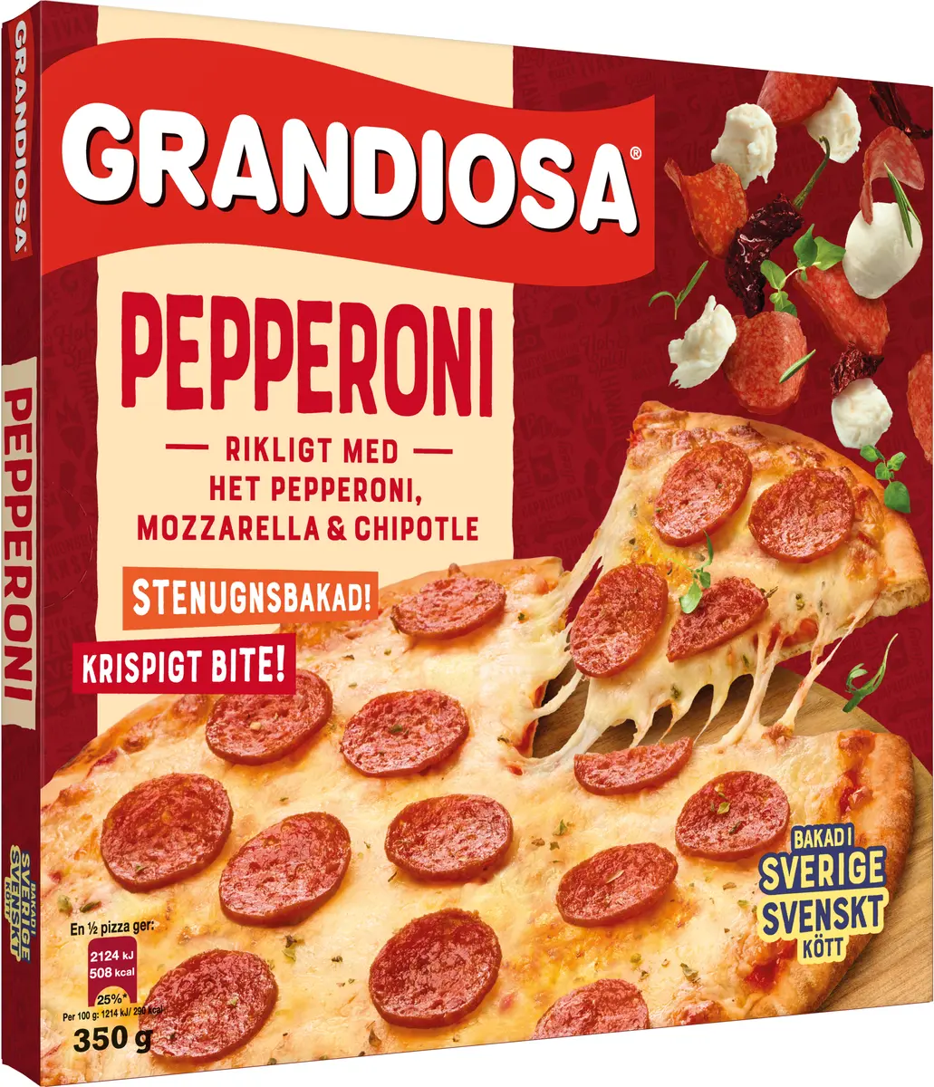 Grandiosa Holy Pepperoni är en klassisk pepperonipizza men tunna skivor pepperoni, mozzarella och oregano. Pizzan har smakrika chipotle-klickar som bidrar till en X-tra Allt upplevelse. Öppna frysen, plocka fram pizzan, in i ugnen så har du middagen klar på nolltid. Grandiosa bakade sin första pizza redan på 70-talet och har blivit en vardagshjälte hemma i frysen. Fryspizzorna finns i flera storlekar och passar lika bra som mellanmål, middag eller om du bara är sugen. Alla pizzorna från Grandiosa är stenugnsbakade och gräddade i Sveriges största pizzeria i Vansbro.