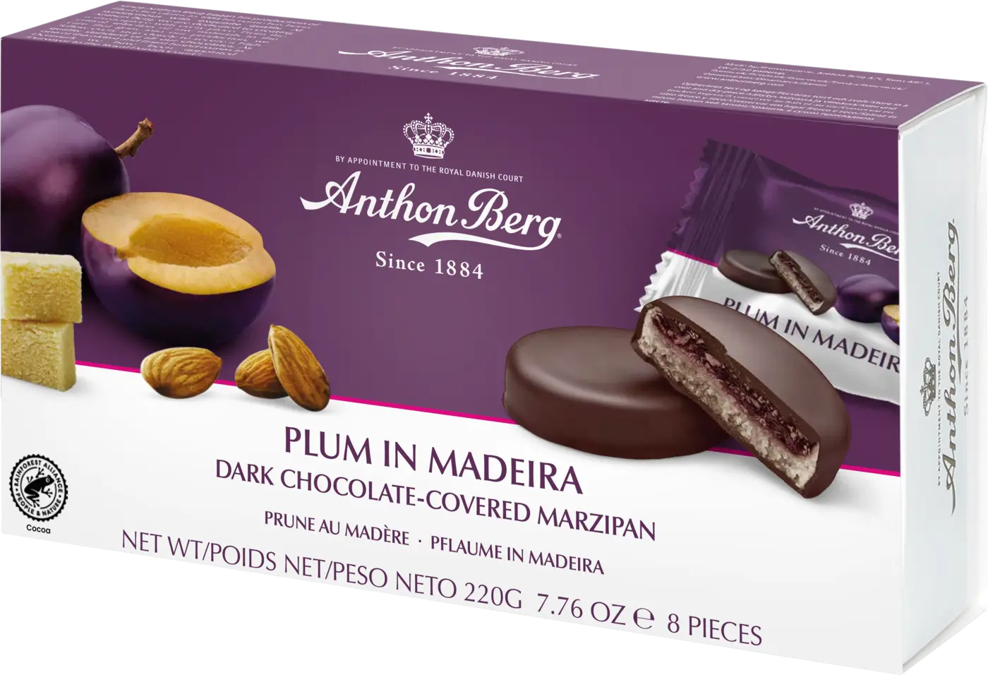 Anthon Bergs små goda "Marsipantårtor", mörk choklad fylld med ljuvlig marsipan och plommon i Madeira. Varje "tårta" är separat förpackad i asken. Även god till en kopp kaffe. Utan palmolja.