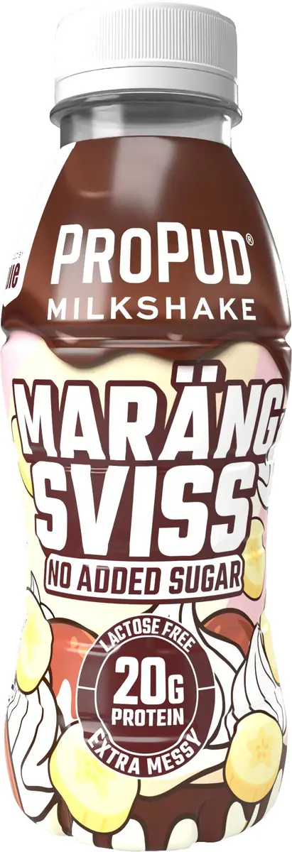ProPud Protein Milkshake Marängsviss - en krämig och len milkshake med smak av choklad, vanilj och banan. Utan tillsatt socker, laktosfri och med 20 g protein per flaska.