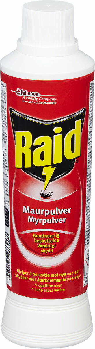 Raid Myrpulver ger ett kontinuerligt skydd mot myror och skyddar mot återkommande angrepp. Läs alltid på baksidan av förpackningen innan användning.