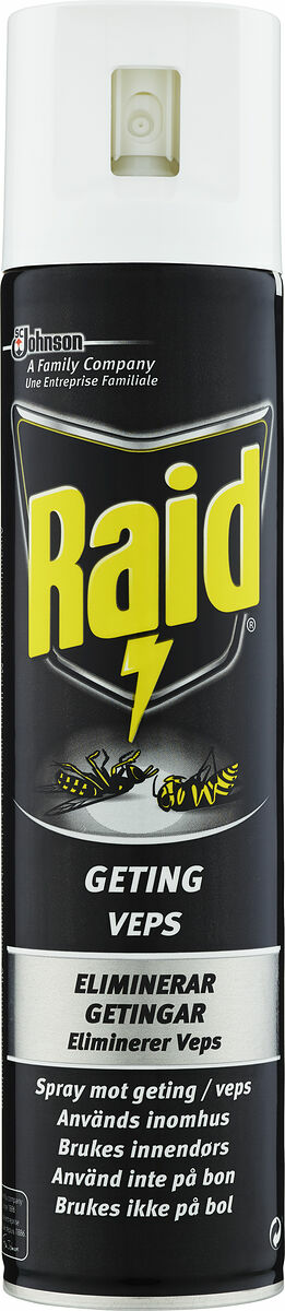 RAID® Spray mot geting har en avancerad sammansättning som dödar enstaka getingar och bålgetingar samt andra flygande insekter som flugor, myggor, mal och knott. Raid® Spray Mot Geting – Bedövar och dödar. Sprayar upp till 6,7 meter, vilket gör att du kan spraya mot getingen från säkert avstånd.