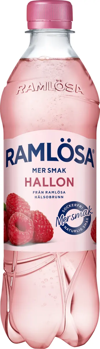 Naturligt mineralvatten* från Ramlösa Hälsobrunn Jacobs källa (98%), kolsyra, hallonjuice från koncentrat (0,3%), syra (citronsyra), sötningsmedel (acesulfam K, aspartam), vatten (0,1%), konserveringsmedel (kaliumsorbat, natriumbensoat), invertsocker, naturliga aromer, svart morotskoncentrat. Innehåller en källa till fenylalanin. *MINERALINNEHÅLL PER l