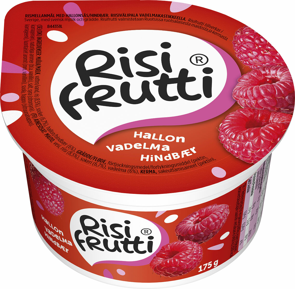 MJÖLK/MÆLK, vatten/vand, ris (8,5%), socker (6,7%), hallon/hindbær (6%), GRÄDDE/FLØDE, förtjockningsmedel/fortykningsmiddel (pektin, karragenan), naturliga aromer (bl.a. vanillin), salt, syra (citronsyra).