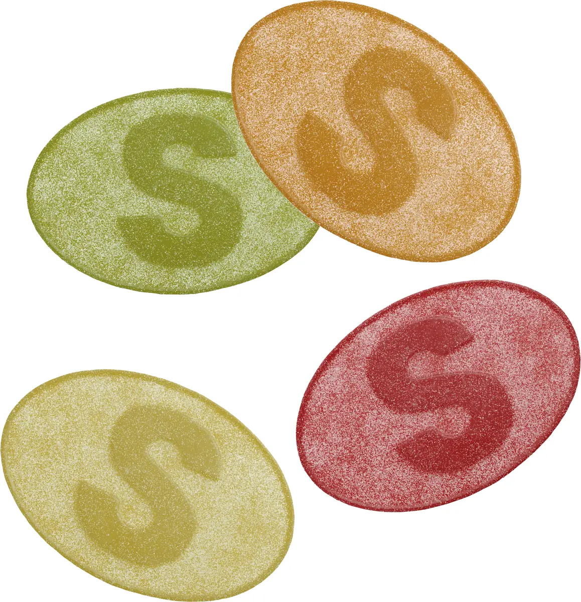 Ingredienser: socker, glukos, gelatin(nöt), surhetsreglerande medel(äppelsyra, natriumcitrat), aromer, färgämnen(kurkumin, karmin, klorofyllinkoppparkomplex).