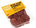 Griskött*, kryddor (vitpeppar, paprika, chili (0,4%), vitlök, koriander, muskotnöt, ingefära, muskotblomma), salt, torkad glukossirap, dextros, paprikaextrakt, antioxidationsmedel: E300; konserveringsmedel: E250; startkultur. *Ursprung: EU. För tillverkning av 100 gram salami chips har 155 gram griskött använts.