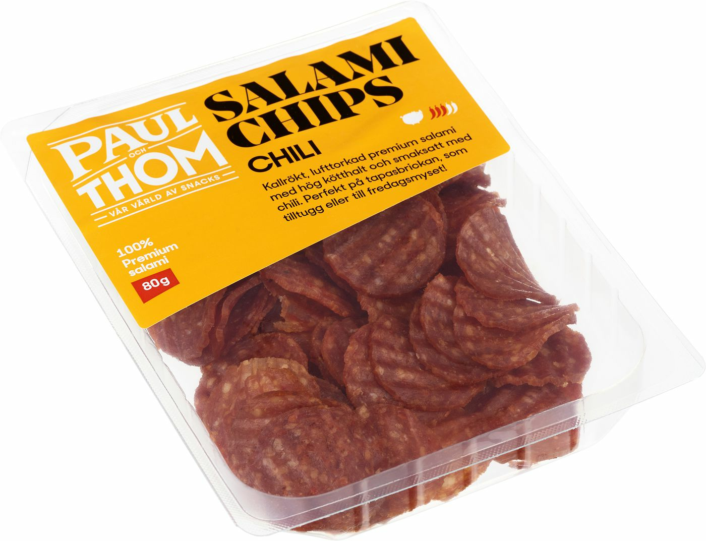 Kallrökt premium salami chili, skivad i tunna räfflade skivor. Efter rökning torkas salamin i 3 veckor för att uppnå bästa kvalitet. Rik och fin balanserad smak. Passar utmärkt till tapas, mellanmål, matlagning eller fredagsmyset.