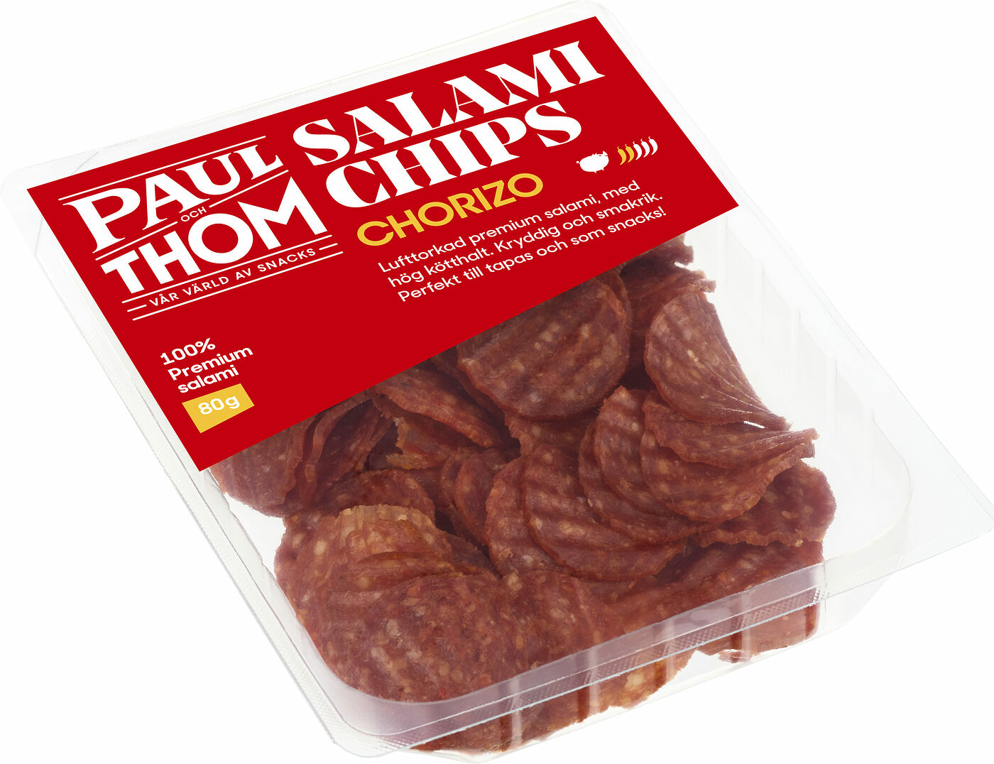 Luftorkad premium salami chorizo, skivad i tunna räfflade skivor. Efter rökning torkas salamin i 3 veckor för att uppnå bästa kvalitet. Rik och fin balanserad smak. Passar utmärkt till tapas, mellanmål och till matlagning.