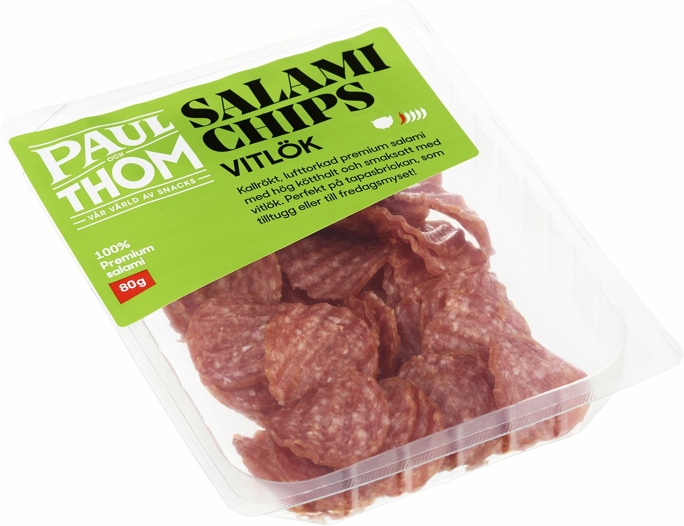 Kallrökt premium salami vitlök, skivad i tunna räfflade skivor. Efter rökning torkas salamin i 3 veckor för att uppnå bästa kvalitet. Rik och fin balanserad smak. Passar utmärkt till tapas, mellanmål, matlagning eller fredagsmyset.