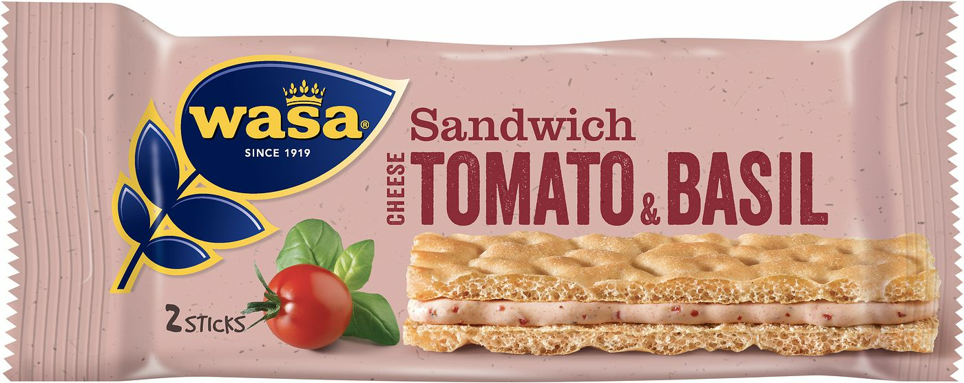 Wasa Sandwich Tomato & Basil är ett veteknäcke i portionsförpackning. Vårt färdiga knäckebröd har en krämig fyllning med smak av ost, tomat och basilika, vilket ger en god knäckemacka med smaker som för tankarna till soliga Italien. Detta knäckebröd med fyllning är delat i två knäckehalvor så att du enkelt kan avnjuta det även på språng. Vårt spröda veteknäckebröd i kombination med den krämiga ostfyllningen blir ett välsmakande mellanmål eller frukost i farten. Wasa Sandwich Tomato & Basil är 100% klimatkompenserad.