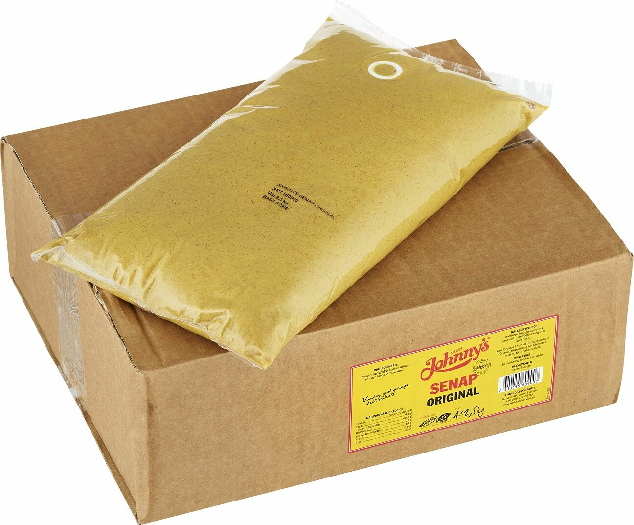 Johnnys Senap Original är en pigg och intensiv senap. Smaken har en tydlig sälta och fin syra som under lång tid sitter kvar i munnen. 1987 började Johnny göra sin karaktärsfulla senap som tillverkas lokalt i vår senapsfabrik i Eslöv. Passar till rätter med god korv men den sätter också sin prägel till en varm smörgås som croque monsieur.