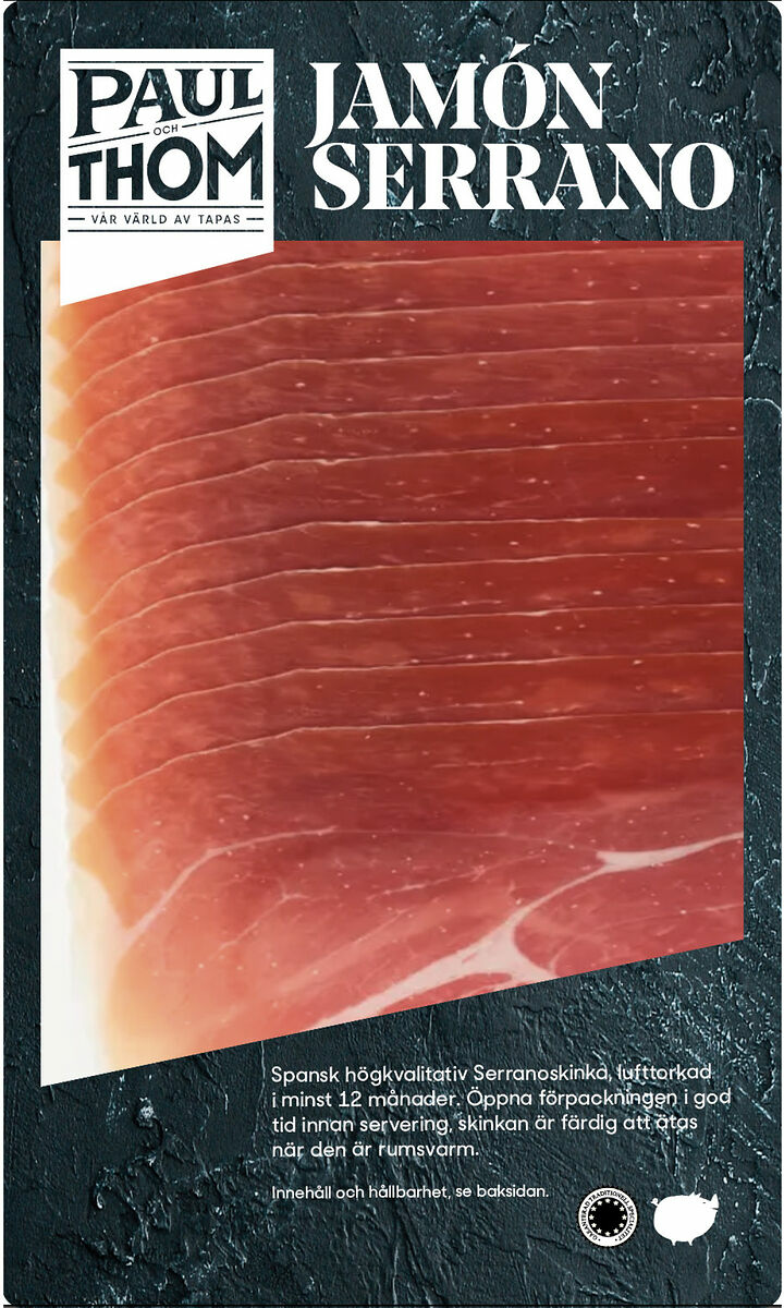 kta Serrano från framstående spansk manufaktur. Nötig med sälta. Lufttorkad i minst 11 månader. Öppna förpackningen och servera rumstempererad för bästa smak. Passar utmärkt som tapas och fingerfood! Servera gärna med Manchego ost och oliver. GTS-märkt (Garanterat traditionell specialitet).