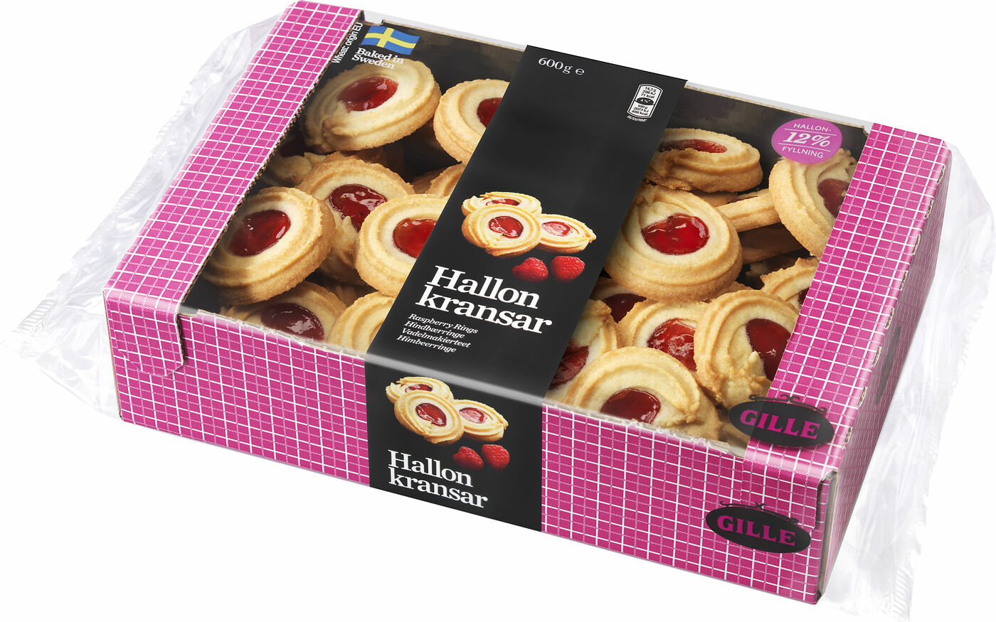 Ingredienser: VETEMJÖL, margarin (vegetabiliska fetter och oljor (palm*, shea, raps, kokos), vatten, salt, emulgeringsmedel: mono- och diglycerider av vegetabiliska fettsyror, naturlig arom, antioxidationsmedel: citronsyra), socker, hallonfyllning 12 % (socker, vatten, hallonpuré 10 %, äppelkoncentrat, förtjockningsmedel: modifierad stärkelse (tapioka), pektin; färgämne: lila morotkoncentrat; surhetsreglerande medel: citronsyra; konserveringsmedel: kaliumsorbat; naturlig hallon arom), invertsockersirap, vatten, arom, mjölbehandlingsmedel: askorbinsyra. Kan innehålla spår av ägg och mandel. *Hållbart producerad och certifierad.
