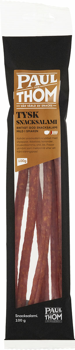 Kallrökt snacksalami kryddad med vitlök, vitpeppar, koriander, muskot. Passar utmärktutmärkt till buffén, tapas eller som mellanmål, efter ett hårt träningspass.
