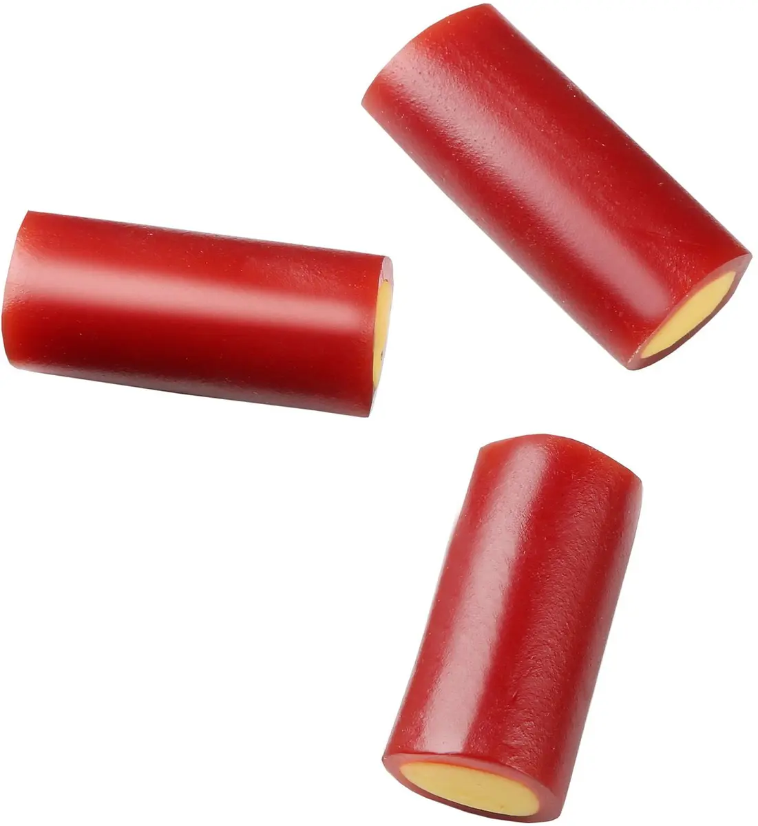 Fylld röd lakrits med fruktsmak. Utan gelatin. Innehåller endast naturliga färgämnen.