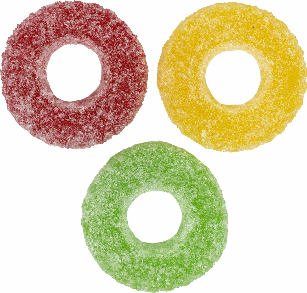 Socker, glukos-fruktossirap, vatten, gelatin, fuktigtighetsbevarande medel (sorbitol), surhetsreglerande medel (äppelsyra), aromämnen (E100, E120, E133)