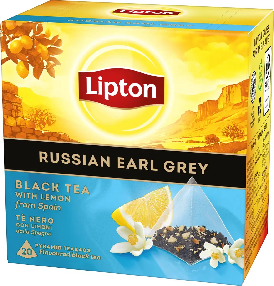 Ta en stund av njutning med den älskade blandningen i Lipton Russian Earl Grey svart te. Detta bergamott-smaksatta te är blandat av experter med uppväckande Ceylonte i kombination med bitar av doftande spanska citroner för en stund av elegans med en twist. Våra unika pyramidformade tepåsar är speciellt designade för en perfekt infusion och ett ögonblick av uppfriskande njutning.