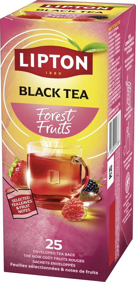 Lipton Skogsbär är ett svart te med bitar och arom från jordgubbar, svarta vinbär, hallon och vinbär. Den riktiga smaken av sommar. Lipton te förpackas individuellt i lufttät förpackning som säkerställer kvalitet, arom, smakintensitet och friskhet. Teet skördas på Rainforest Alliance-certifierade odlingar.