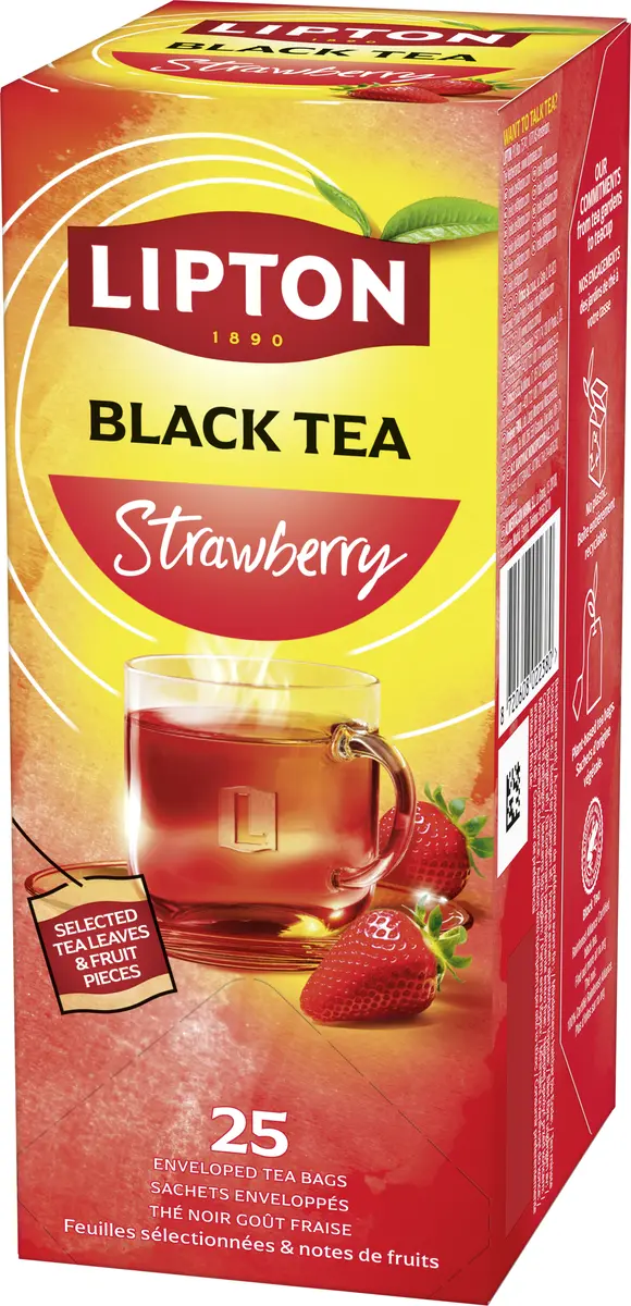 Lipton Strawberry Tea är ett svart te med smak av solmogna jordgubbar. Lipton te förpackas individuellt i lufttät förpackning som säkerställer kvalitet, arom, smakintensitet och friskhet. Teet skördas på Rainforest Alliance-certifierade odlingar.