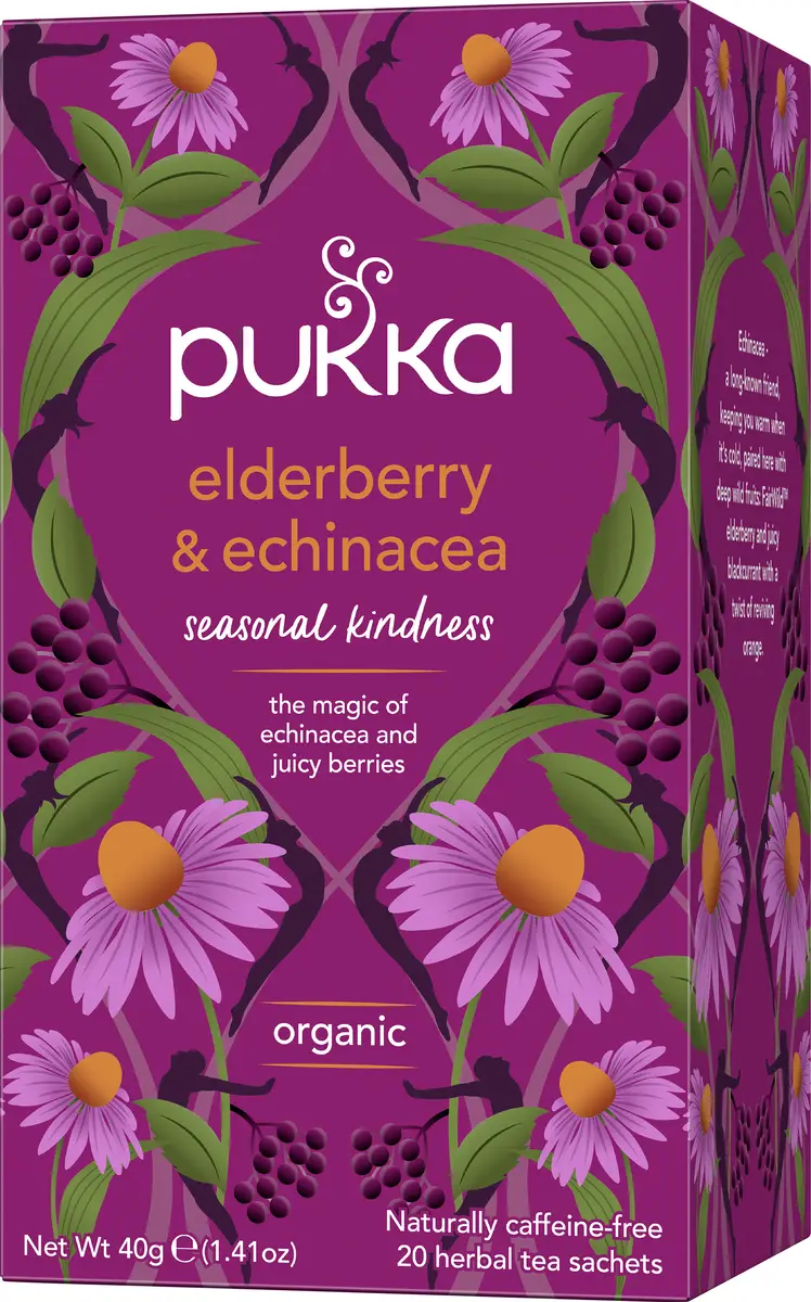 Ingredienser: Lakritsrot*, ingefära*, rot och blad från echinacea purpurea (10%)*, rödbeta*, anisfrö*,nypon*, fläderblom (8%)*, pepparmynta*, apelsinskal*, fläderbär (6%)*, hibiskusblomma*, naturlig smak från essentiell apelsinolja*, naturlig svartvinbärssmak. (*= Ekologiskt certifierad ingrediens (99.9%)).