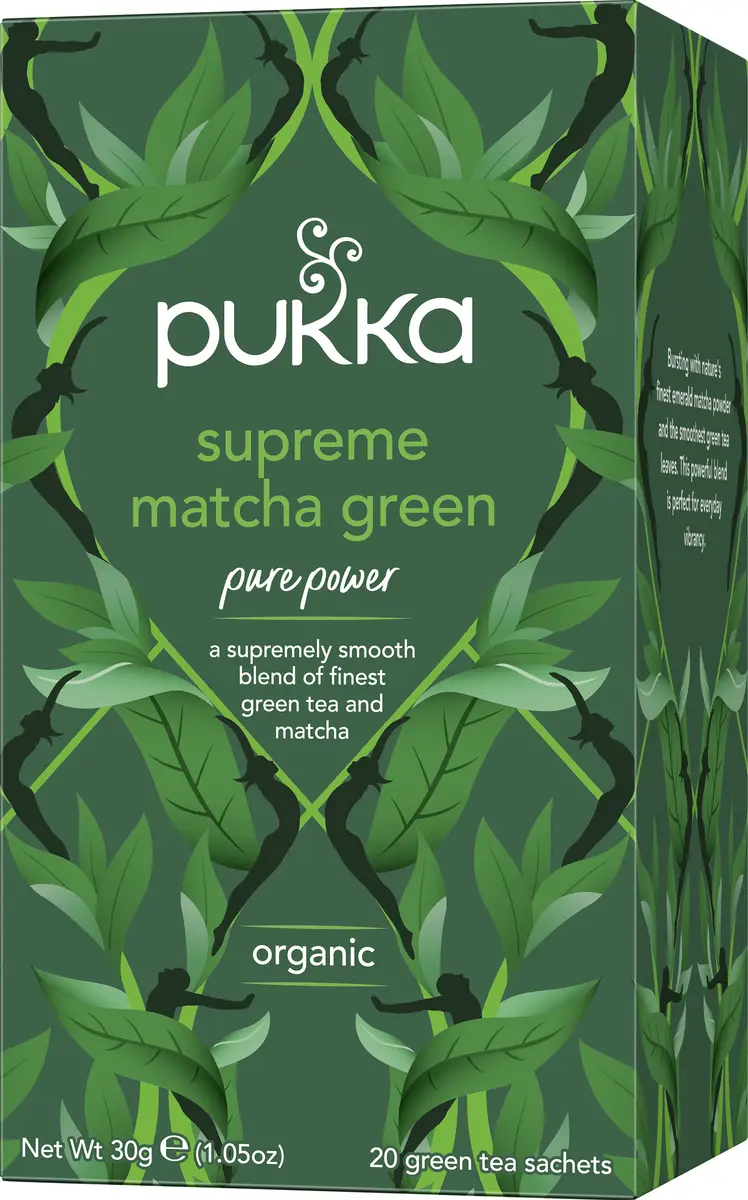 Pukka Supreme Matcha är ett sammetslent helbladste med fyllig smak. Det smaragdgröna matchapulvret är en fantastisk ingrediens som här kombinerats med tre gröna helbladsteer; Kinesiskt Sencha, indiskt Oothu och vietnamesiskt Pin Ho Wild Jade. Ekologisk och Fair for Life.