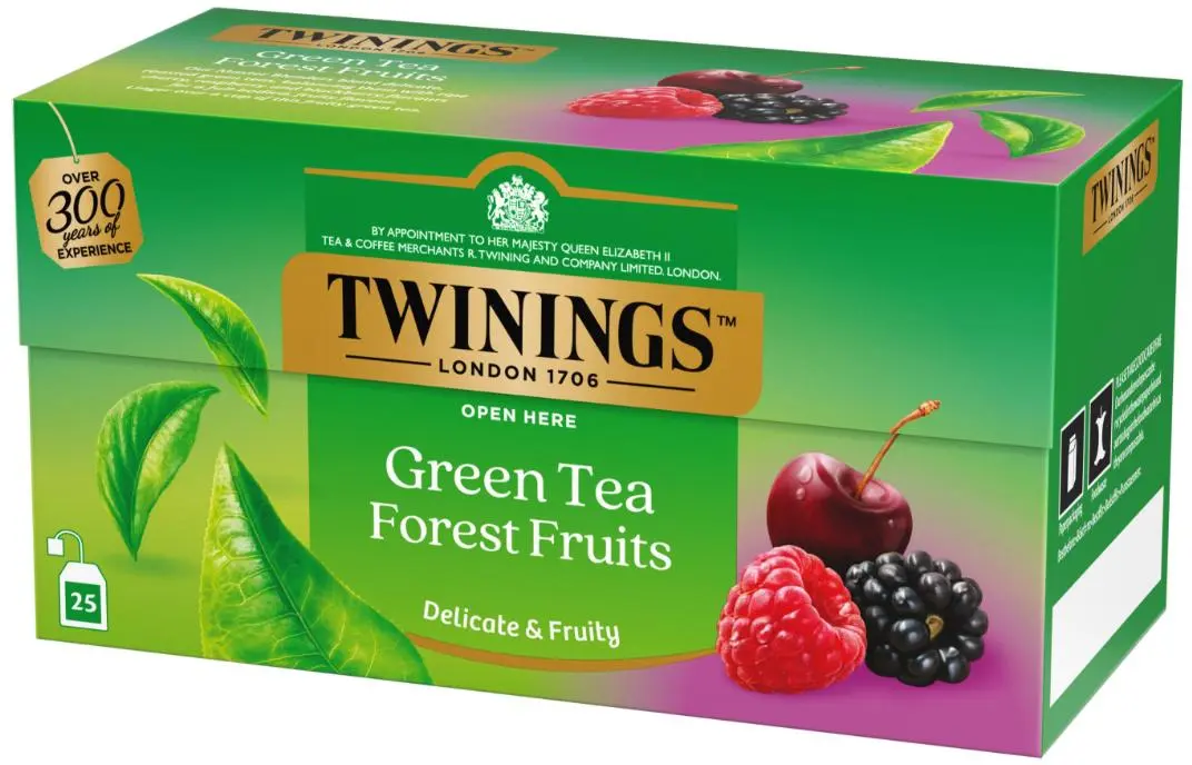 Ingredienser: Grönt te, skogsbärsarom (16%), torkade hallon (1%), torkade björnbär (1%), torkade körsbär (1%).