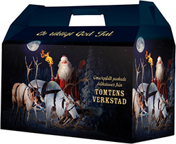 Tolv otroligt goda och utsökta varor ingår omsorgsfullt packade av tomteverksta’n med pappersull i Tomtelåda Mellan 359x194x202 mm. Bruttovikt 4,6 kg. Levereras som kylvara.