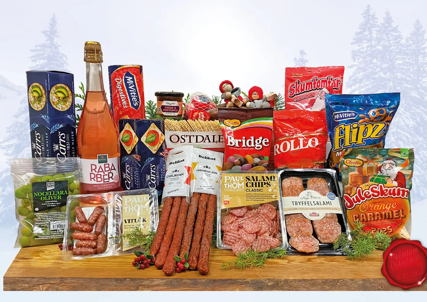En härlig mix av julsmaker och delikatesser i form av salami, ost och kex. Dessutom bubblande dryck och smakfulla gottepåsar!