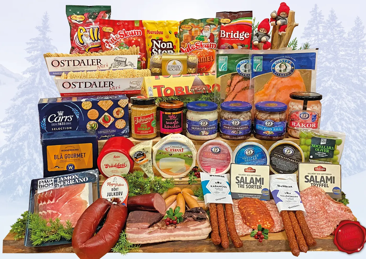 Trettiofem otroligt goda och utsökta varor ingår omsorgsfullt packade av tomteverksta’n med pappersull i Tomtelåda Stor 381x253x250 mm. Bruttovikt ca 11,0 kg. Levereras som kylvara.
