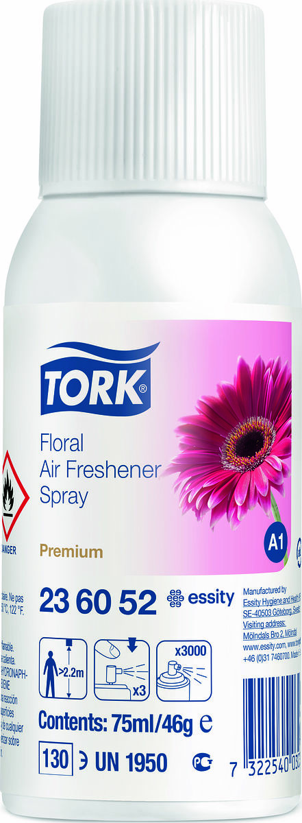 Reglera obehagliga lukter effektivt i ditt toalettutrymme med Tork Airfreshener Spray Blom. Sprayerna innehåller koncentrerade doftoljor och luktneutraliserande innehåll för att avlägsna dålig lukt och samtidigt avge en varaktig fräsch doft. Sprayerna passar i Tork Dispenser Airfreshener Spray.