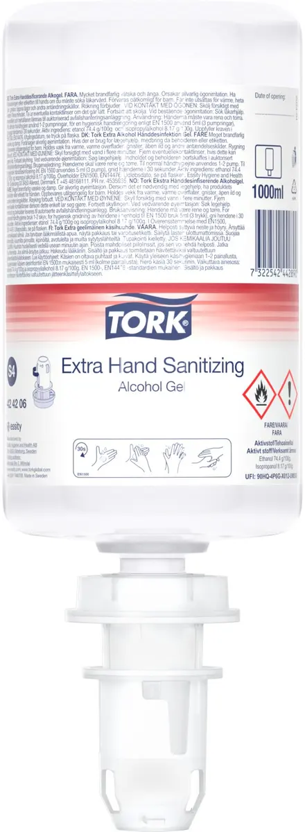 Tork Extra Handdesinficerande Alkogel dödar effektivt mikroorganismer för att hjälpa till att motverka infektionsspridning. Den mest effektiva gelen i sortiment från Tork mot bakterier, svampar och alla virus. Idealisk för daglig handhygien. Lämplig för användning inom vården. Den lätta, uppfriskande gelen klibbar inte på händerna och innehåller fuktgivande ingredienser. Skonsam mot känslig hud, enligt omfattande, dermatologiskt kontrollerade användartest. Lämplig för alla dispensrar för tvål och handsprit (S4) från Tork.