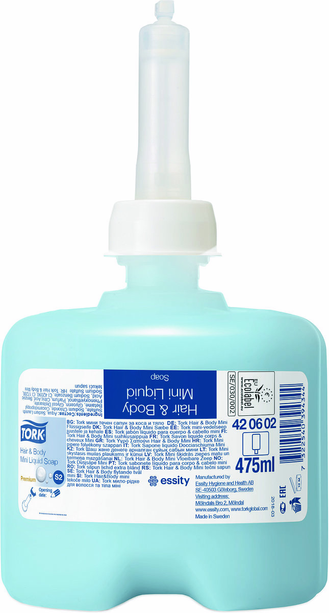 Tork Hair & Body Flytande Tvål är duschtvål och schampo i ett vilket ger en effektiv kropps- och hårtvätt. Den är lämplig för duschar på hotell, skolor och sportanläggningar. Den har en mild formulering, med uppfriskande unisexdoft som ger huden och håret en mjuk och behaglig känsla. Passar i Tork Dispenser Flytande Tvål Mini som är enkel att använda och ger alla användare utmärkt handhygien.