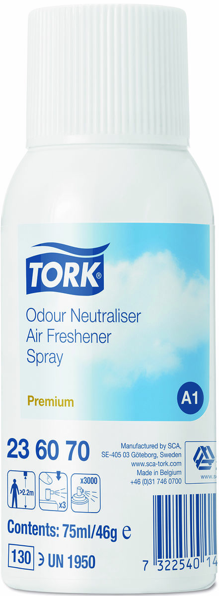 Reglera lukt i ditt toalettutrymme effektivt med Tork Airfreshener Spray Neutral Sprayerna innehåller koncentrerade doftoljor och luktneutraliserande innehåll för att avlägsna dålig lukt och samtidigt avge en varaktig fräsch doft. Sprayerna passar i Tork Dispenser Airfreshener Spray.