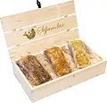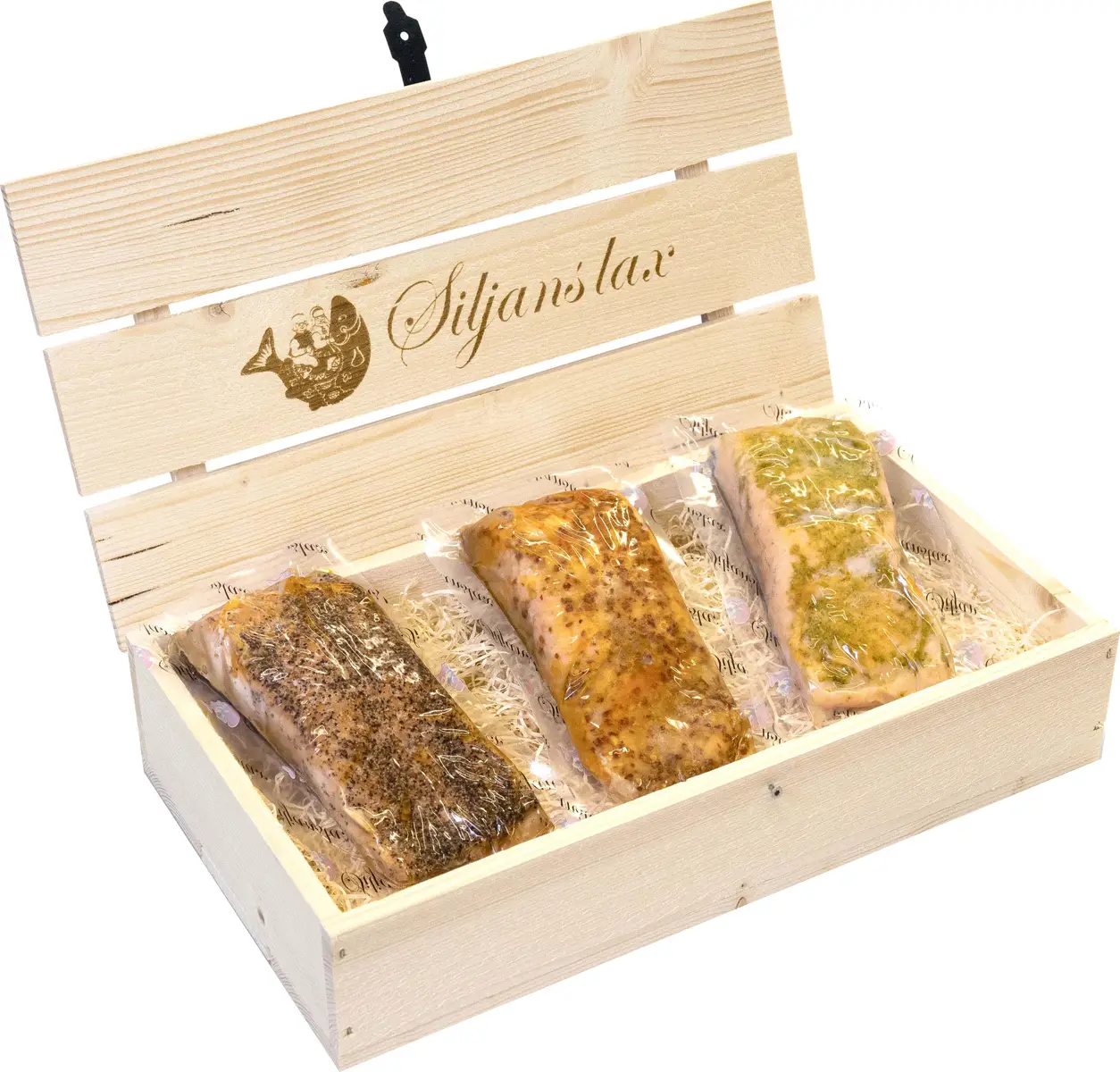 Tre laxar i en laxask innehåller: En ugnsmarinerad lax med smak av dill och en med smak av chili samt en varmrökt lax. Totalt >1000 g. Laxen är urbenad och heltrimmad och levereras i en lyxig trälåda.