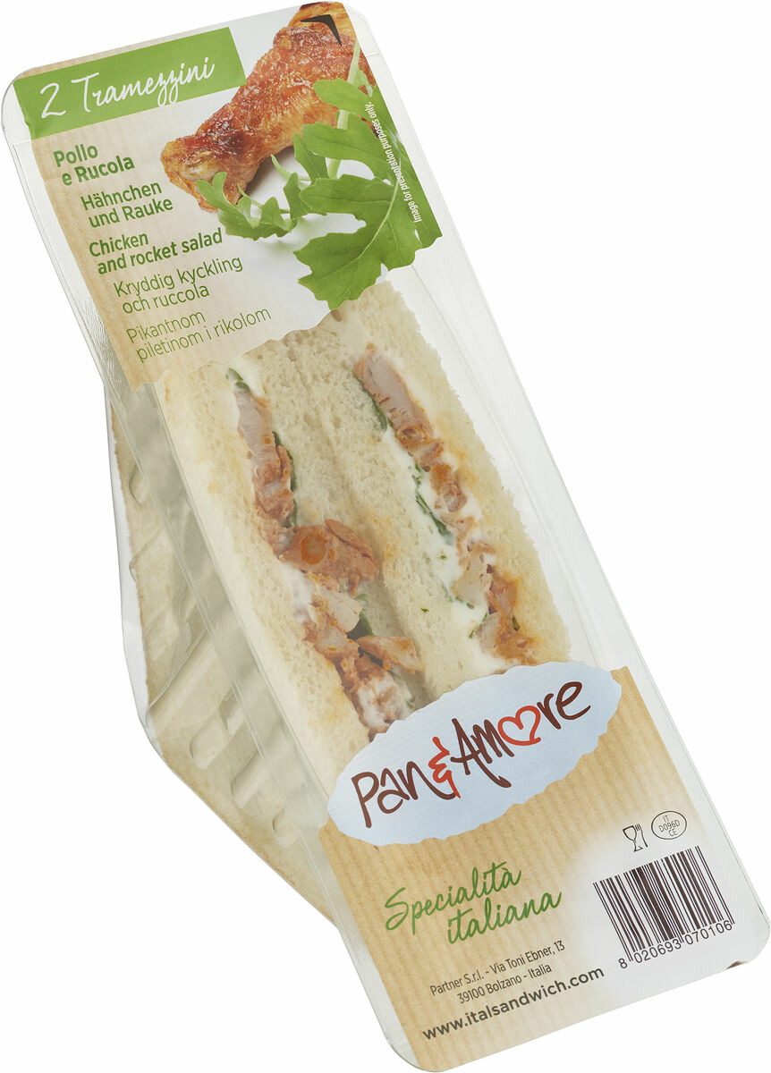 Ingredienser: Bröd: VETEMJÖL, vatten, jäst, salt, vinäger, VETEPROTEIN, Emulgeringsmedel: E472e-E471, rapsolja och palmolja. Fyllning: Kryddig kyckling ( 25%): kycklingkött, salt, peppar, vit peppar, svartpeppar, vitlök, glukos, socker, maltodextrin, rapsfröolja. Majonnäs ( 21%): solrosolja, vatten, pastöriserade ÄGG, majsstärkelse, vinäger, socker, salt, citronsaft, SENAP, alkoholbaserad vinäger, kryddor, naturliga/ aromer, Konserveringsmedel: E200, surhetsreglerare medel : E330. Ruccola (4%). Tillverkad i en anläggning som använder: spannmål som innehåller gluten, kräftdjur, ägg, fisk, soja, mjölk, nötter, selleri, senap, sesamfrö, svaveldioxid, lupiner.